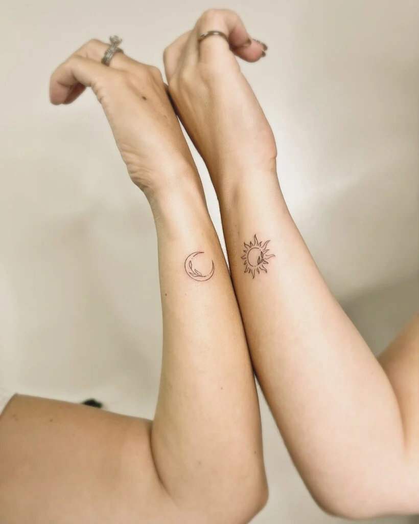 These matching cosmic tattoos honor a friendship that shines across the universe. One arm features a radiant sun surrounded by delicate starbursts, symbolizing energy and light. The other bears a graceful crescent moon encircled by fine orbit lines, representing calm and intuition.