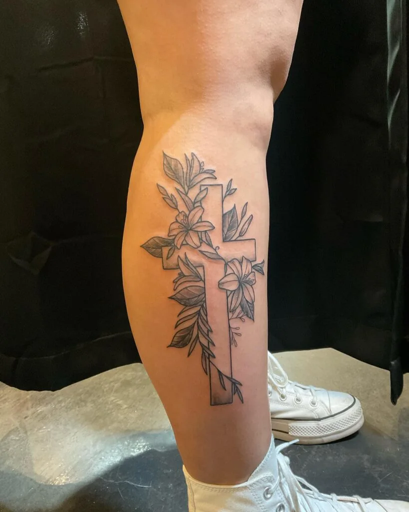 This eye-catching calf tattoo features a bold, outlined cross entwined with blooming lilies and leafy branches. The floral elements wrap gracefully around the cross, softening its strong structure with natural beauty.