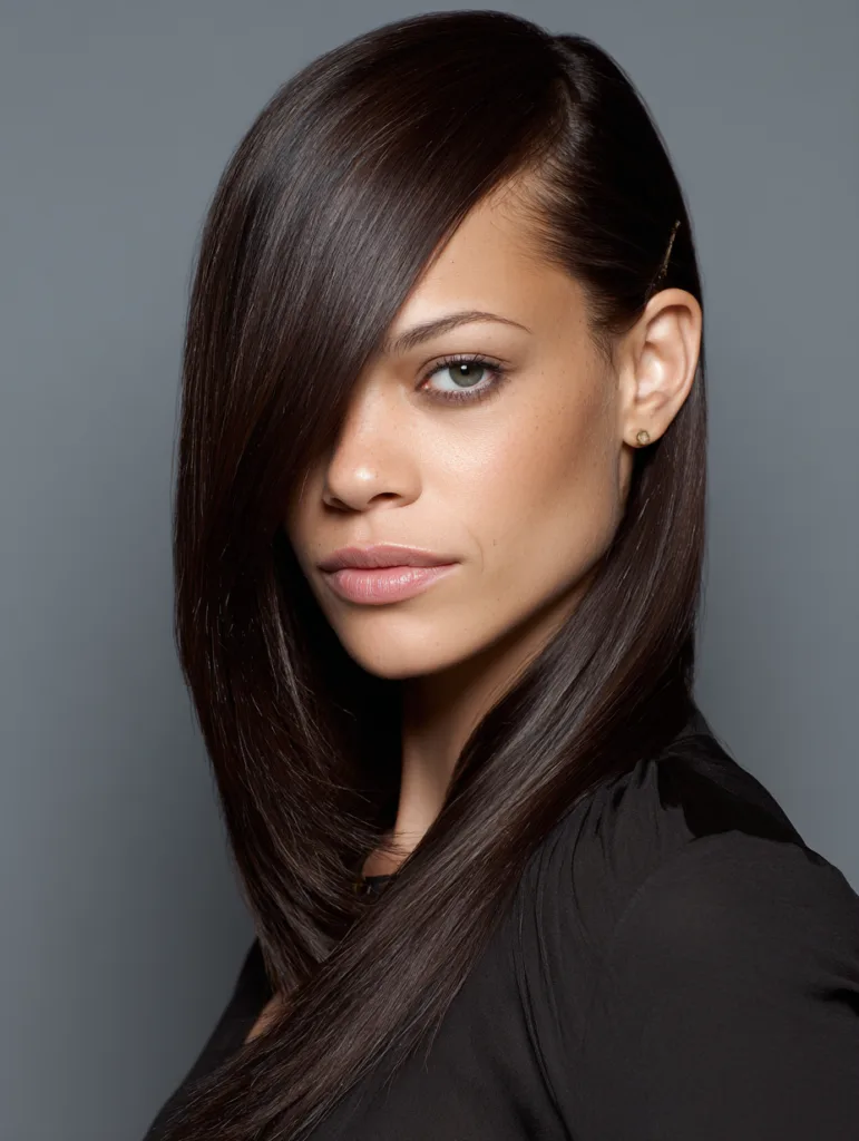Use a flat iron to smooth the lengths and finish with a lightweight serum to control flyaways. Keep the part crisp for a cleaner effect. This style requires minimal upkeep once set, making it a good choice for anyone who prefers quick styling with a polished outcome.