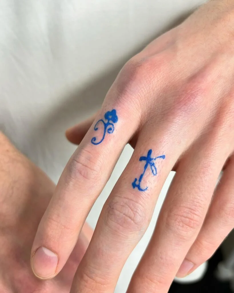 These small finger tattoos add a playful splash of blue ink to your hands. One finger features a delicate swirl and bloom that feels light and whimsical, while the other showcases a tiny anchor intertwined with a rope.