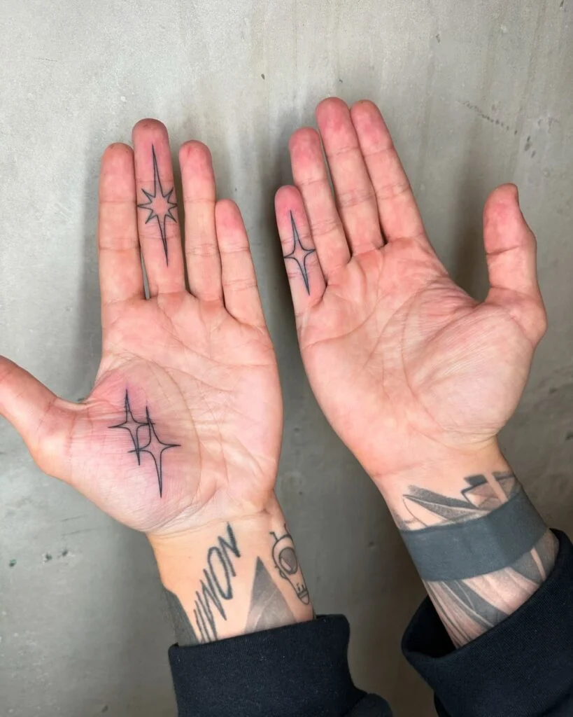 These minimalist starburst tattoos bring a bold, cosmic energy to the hands. Designed with fine black lines and sharp, symmetrical shapes, each palm features a different star motif — some more intricate, some more subtle — creating a balanced and intriguing look.