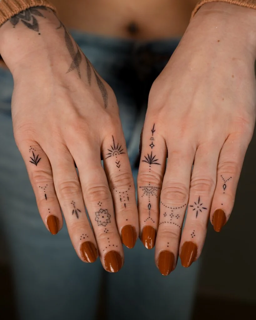 This beautiful set of tiny finger tattoos is full of boho charm and subtle symbolism. Delicate dotwork, fine lines, and minimalist shapes come together to create a design that feels like personal jewelry. Tiny sunbursts, stars, and ornamental elements trail across knuckles and fingers, capturing a sense of lightness and wonder.
