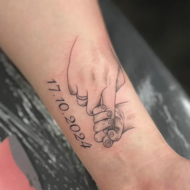 This sentimental tattoo captures the bond between parent and child with a touching image of a baby’s tiny hand gently grasping an adult’s finger. The design is done in clean black linework, giving it a timeless and heartfelt feel.