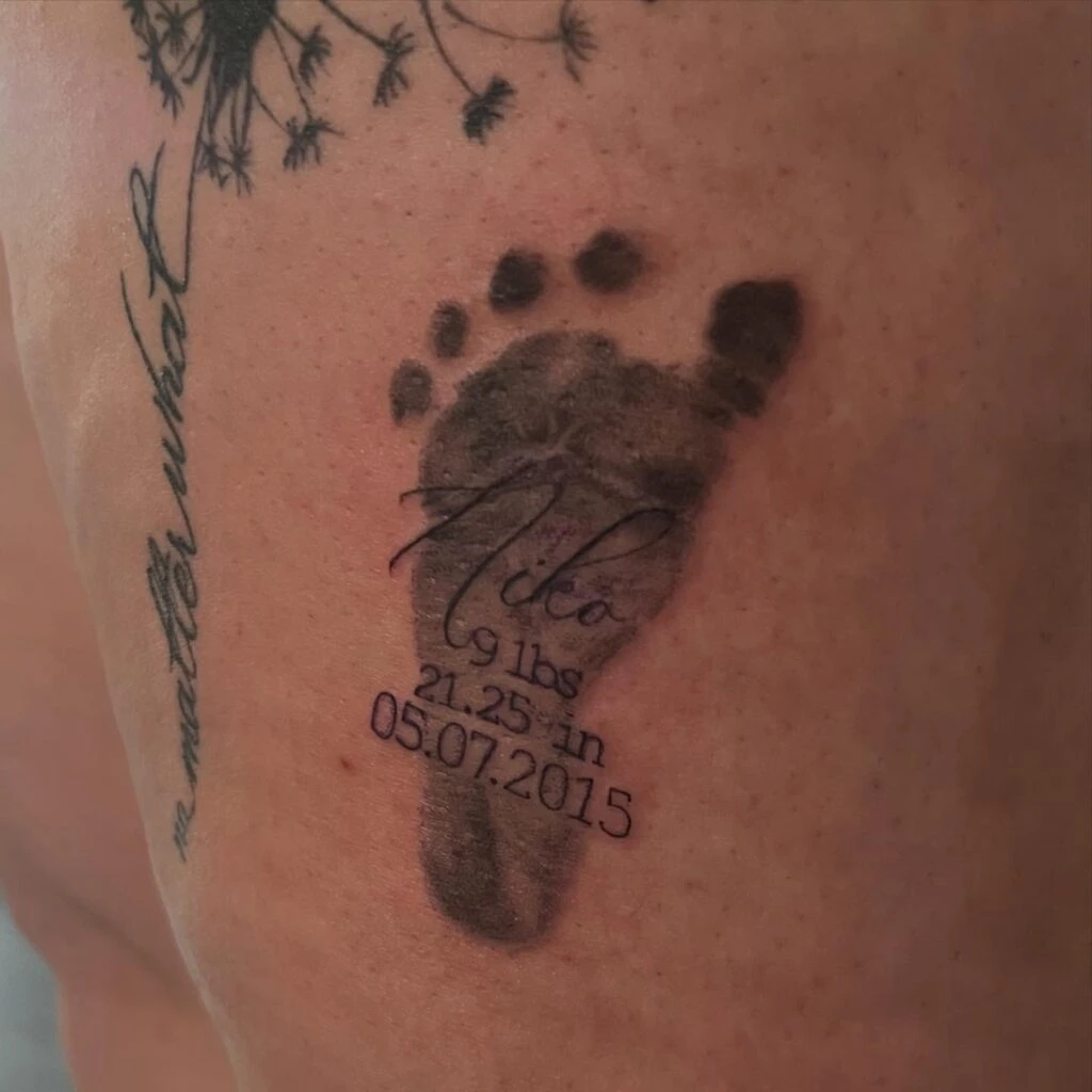 This tattoo captures the tender memory of a baby’s arrival with a lifelike footprint pressed onto the skin. The print’s natural smudges and gentle texture give it an authentic, heartwarming feel.