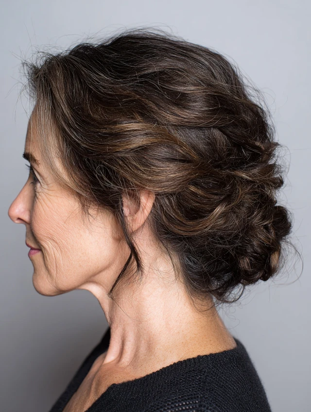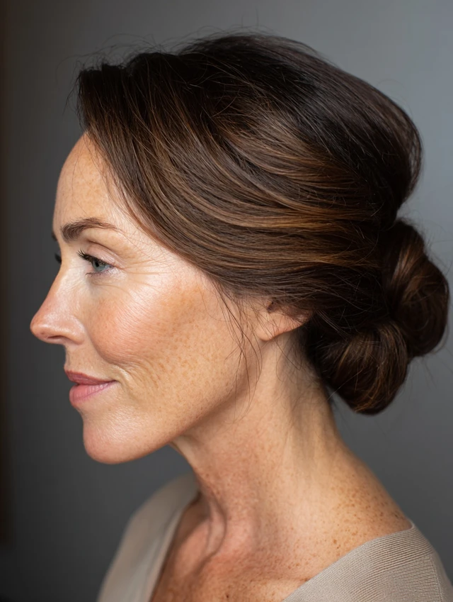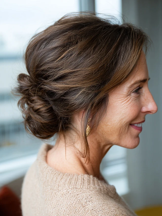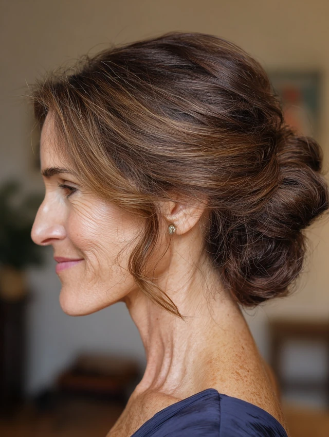 Twist loosely and secure with pins. Pull out soft face-framing strands. This style suits workdays and formal occasions. It feels polished with minimal effort.