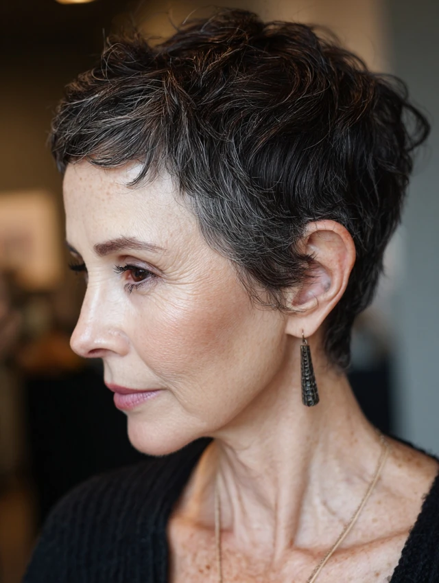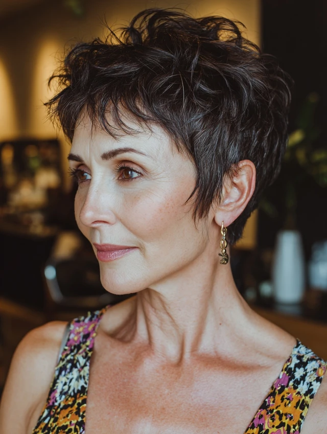 A textured pixie requires minimal styling. Short layers at the crown create lift naturally. This cut flatters oval and petite face shapes. Fine hair benefits from built-in volume.