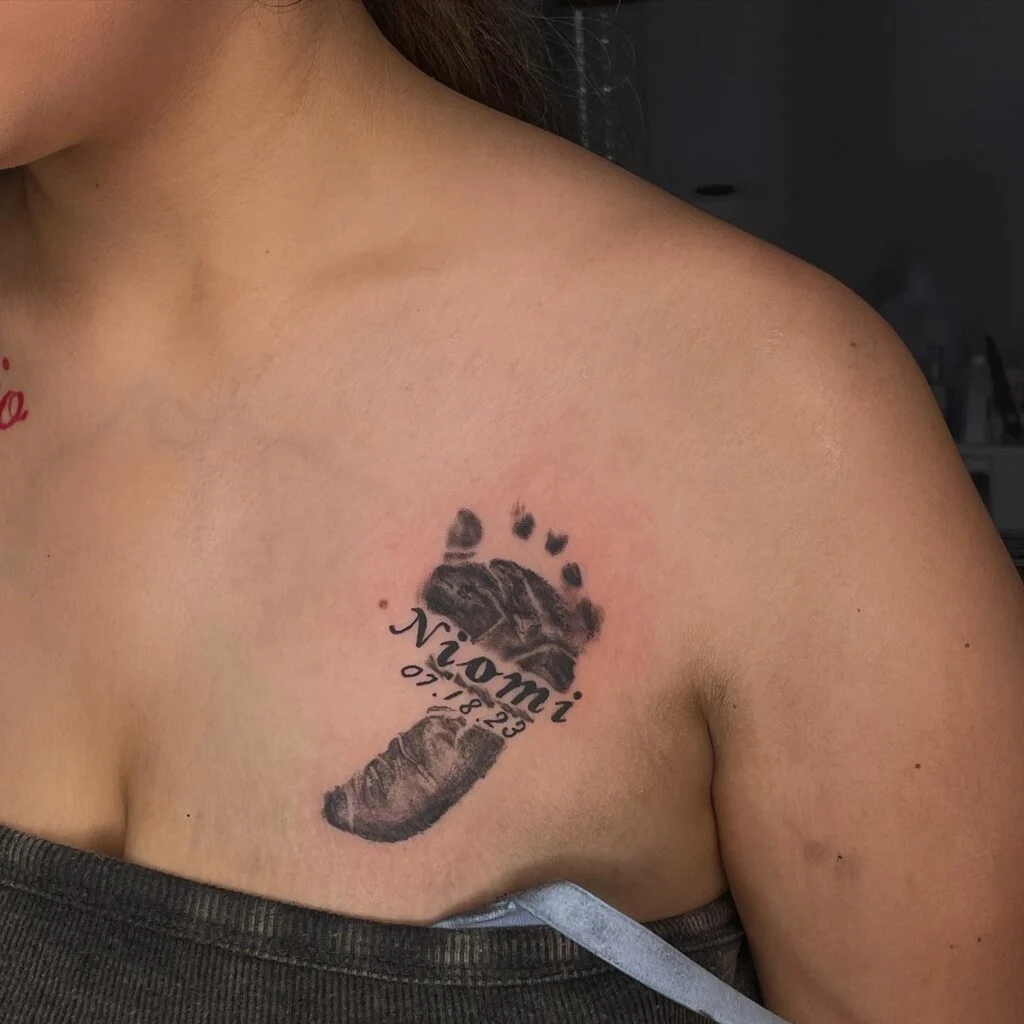 Baby Footprint Tattoo on Chest with Name and Date