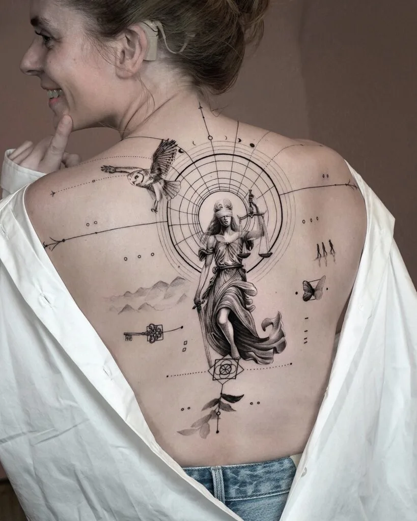 This stunning back tattoo features Lady Justice as the central figure, blindfolded and holding her signature scales and sword. Surrounding her is a radial grid design, giving a cosmic or celestial vibe. Complementing elements include an owl in flight—symbolizing wisdom—along with a butterfly, key, leaves, mountains, and small walking figures, each tied together with precise dotwork and geometric lines.