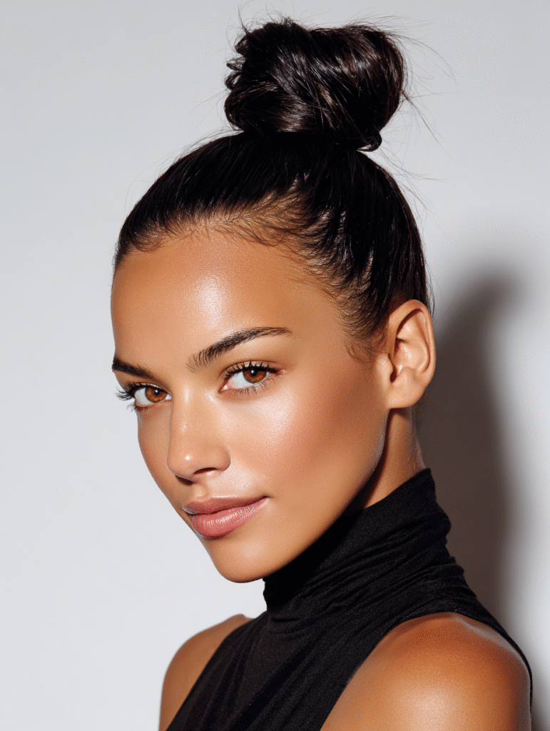 The sleek high top knot gives you a clean style that keeps the focus on your face. Pull your hair upward, smooth the sides, and twist the bun tightly for structure that lasts all day. This look reveals your neckline and highlights your brows, making it a strong choice for photos.