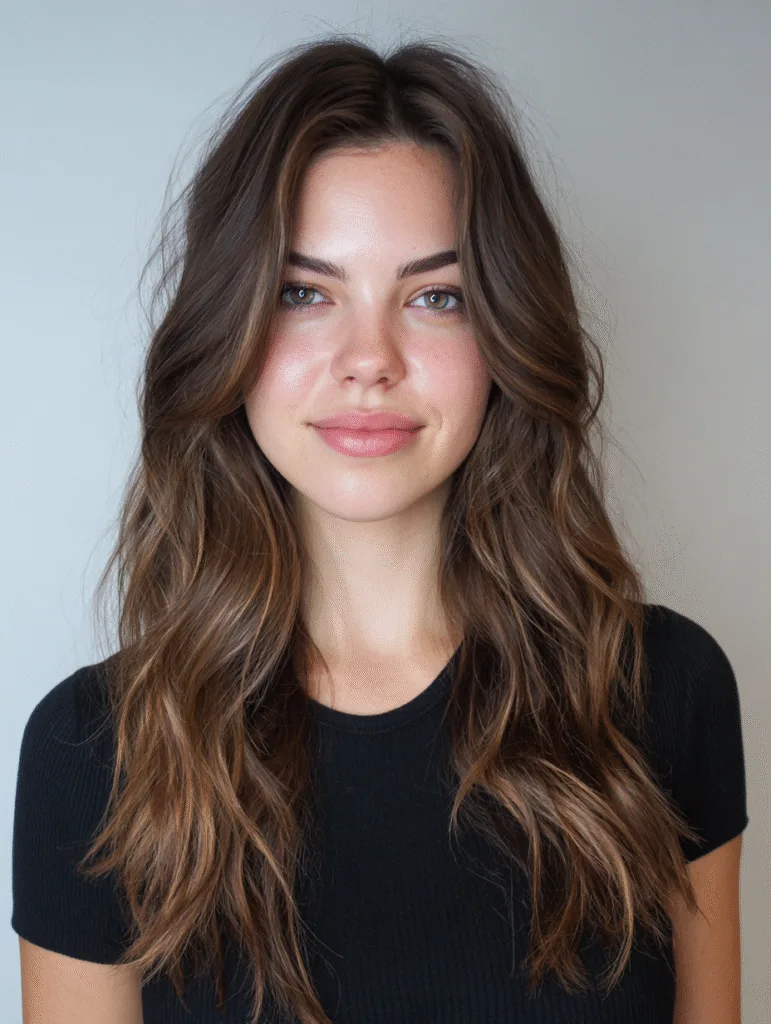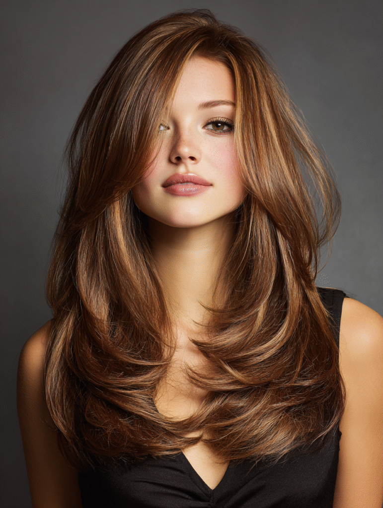The length frames your face and gives you room for different parting styles. This look works well for girls who want something glamorous without constant effort. It pairs easily with casual clothes, night-out outfits, or simple everyday styles because the layers stay flattering.