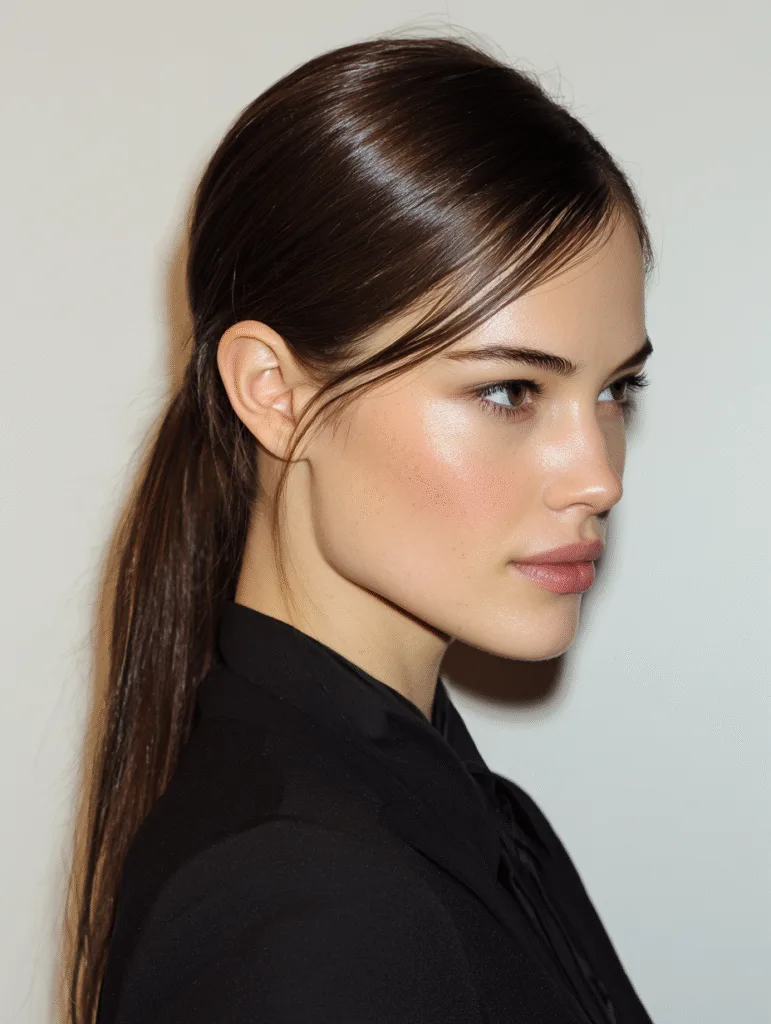 The sleek low ponytail with a side part creates a calm, controlled look that still feels strong. You smooth your hair downward, define the side part carefully, and secure the ponytail at the nape. This style highlights your cheekbones because the hair stays close to your face.