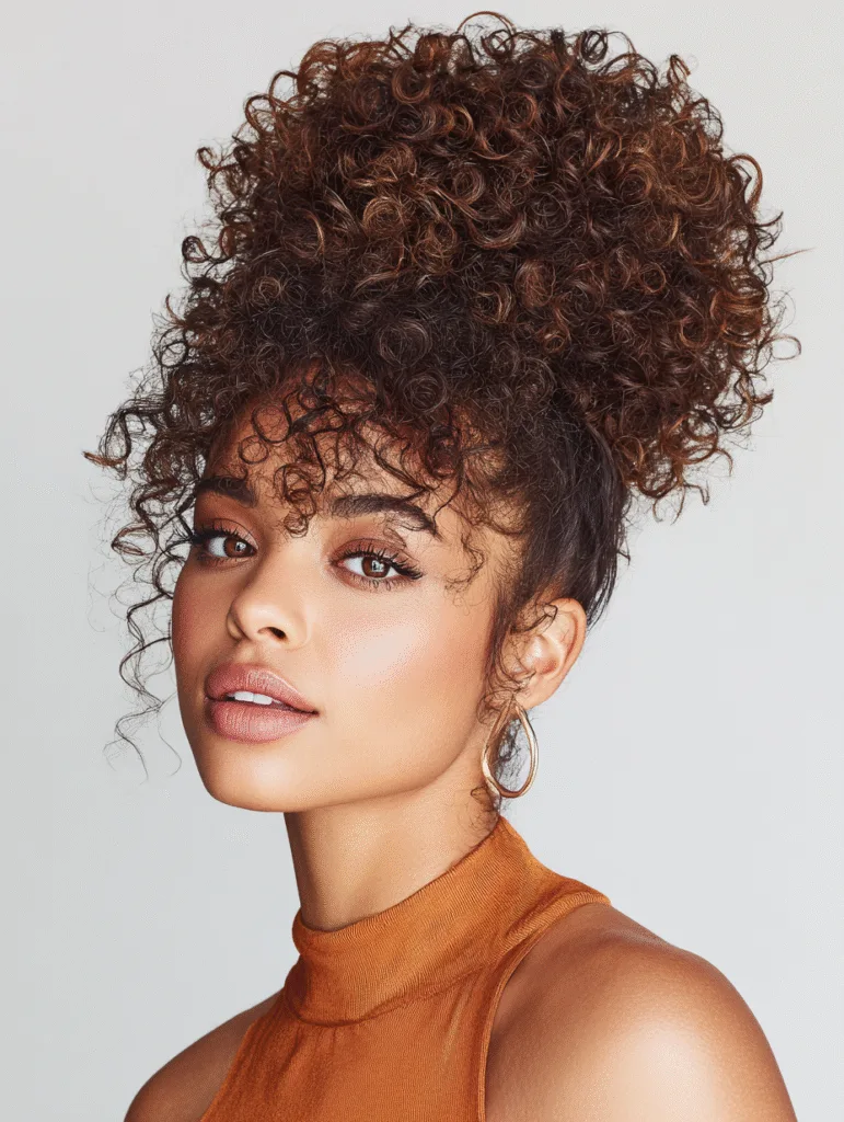 The high curly puff with laid edges gives you volume that stays soft while keeping the front smooth. You gather your curls at the crown and secure them tightly so the puff rises upward. This placement opens your face and highlights your eyes.