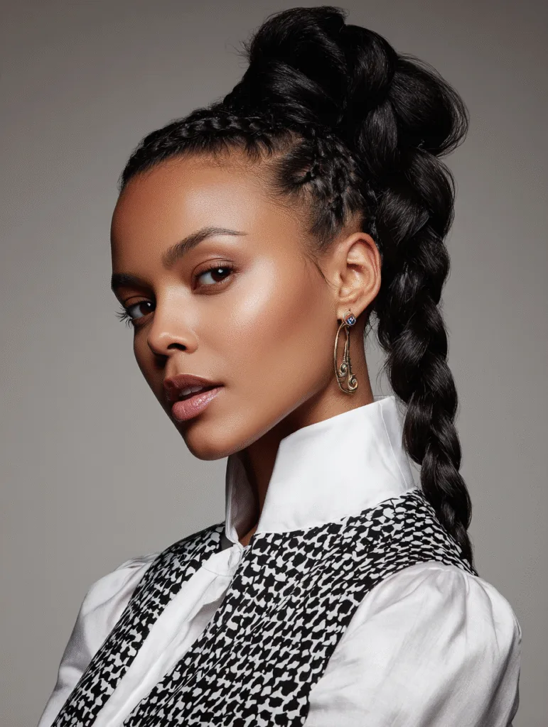 The high braided ponytail creates a confident look by combining a lifted base with a long, clean braid. You pull your hair up tightly to smooth the sides, then braid the length so it stays structured all day. The height adds balance by lifting your features and sharpening your jawline.