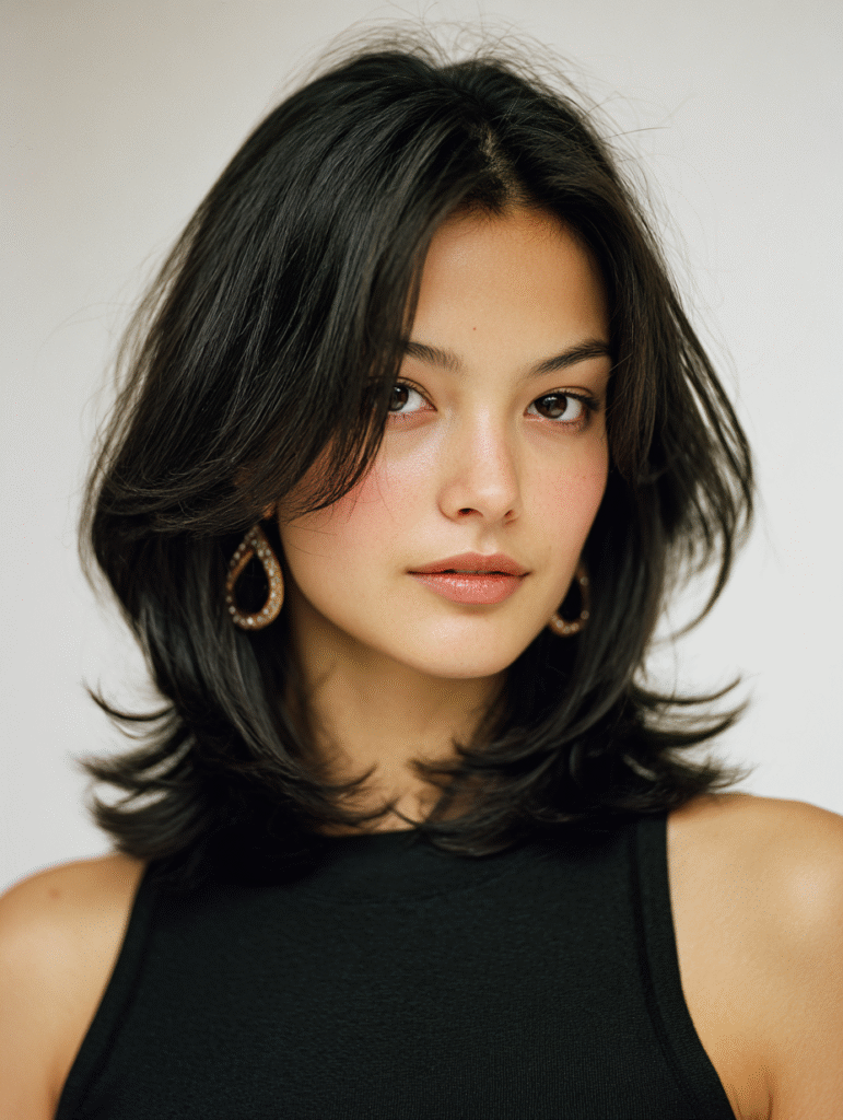Use a flat iron to guide the ends outward, then finish with a light spray to hold the curve. This style works with middle or side parts. It creates a clean silhouette that pairs well with minimal makeup, strong liner, or bold earrings.