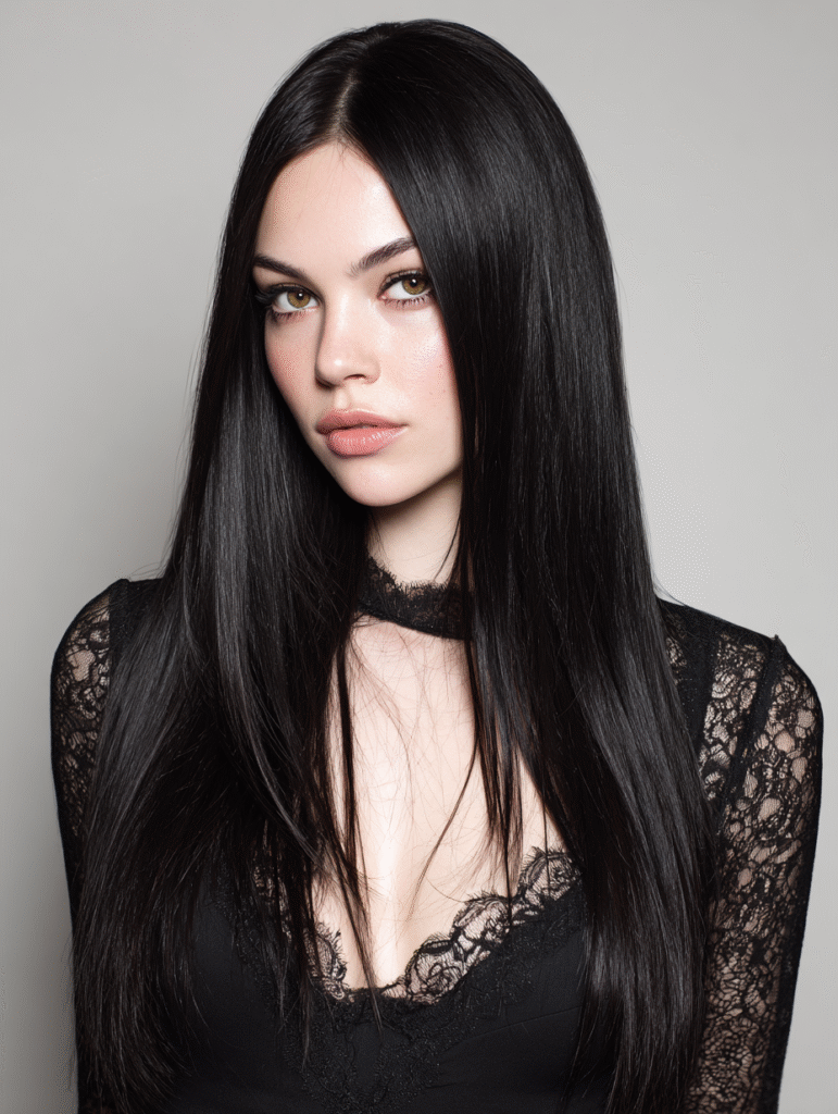 Long jet-black straight hair creates a strong, dramatic hairstyle that stays sleek from the top to the ends. The dark color adds intensity, making the straight lengths stand out even more. You can part it in the middle for balance or move the part slightly to change the framing.