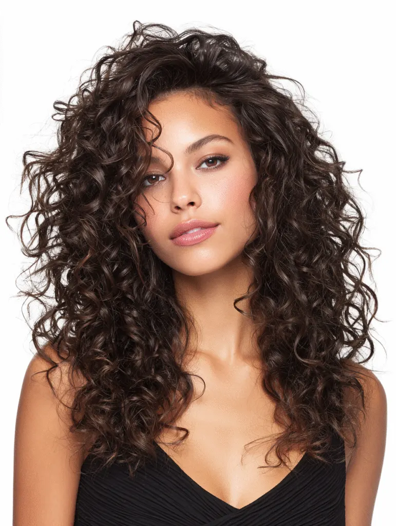 The side sweep creates movement that keeps the top section interesting without feeling heavy. This look suits medium or long hair because the curls need space to expand. It pairs well with dressy outfits, casual clothes, or photo-ready makeup.