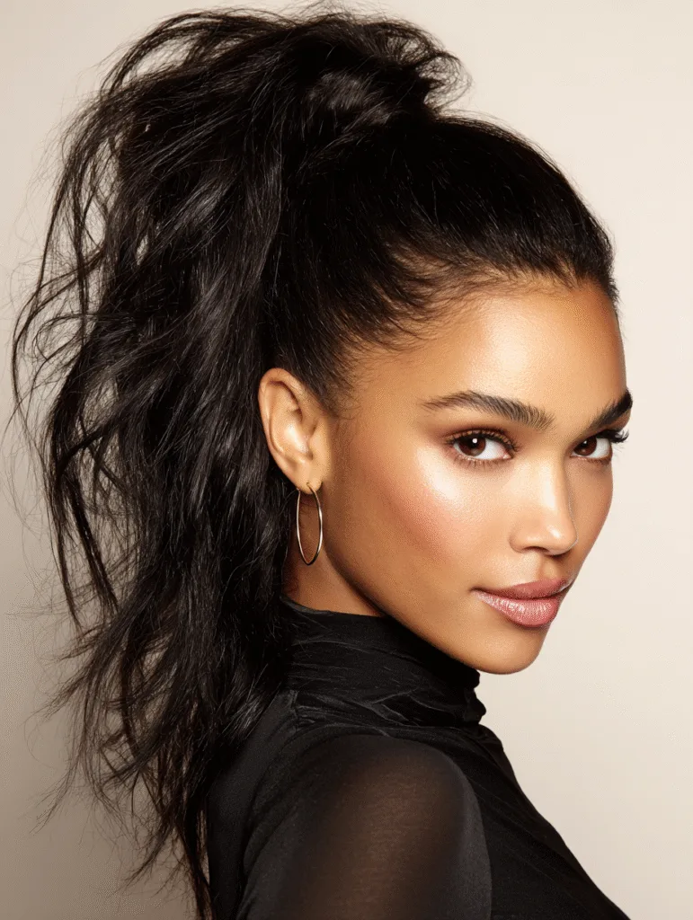 The high voluminous ponytail creates a confident look that pulls your features upward and highlights your cheekbones. You gather the hair at the crown, smooth the sides, and secure it tightly for structure. Adding volume at the base gives the ponytail height that stays noticeable from every angle.