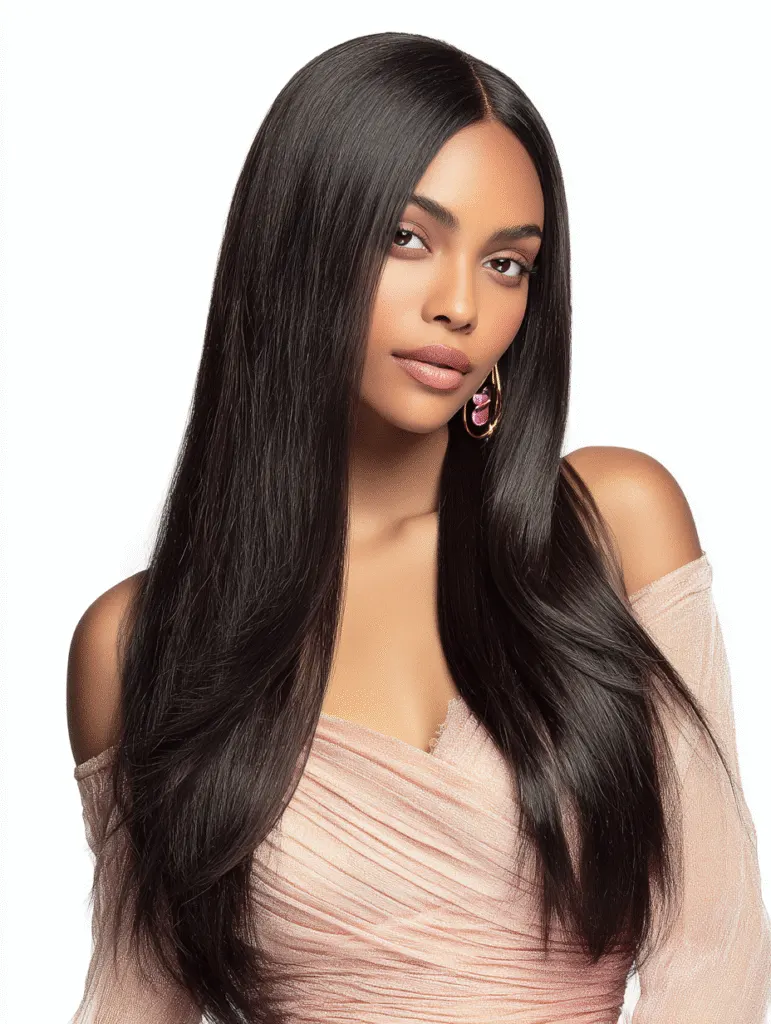 This look needs a smooth finish, so use a straightener and light serum to control flyaways. The length adds presence in every setting. It works with simple outfits, bold makeup, or clean natural looks because the hair already delivers impact.