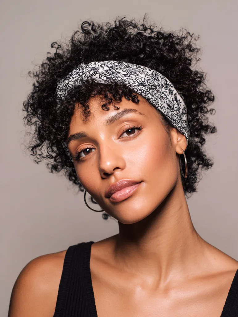 This style lifts the crown while keeping the rest of the hair loose, which creates balance and volume. It suits almost every face shape because the height at the top opens your features while the loose ends soften the overall appearance. Curly and wavy textures look especially lively with this style since the bandana secures the lift without flattening your curls.