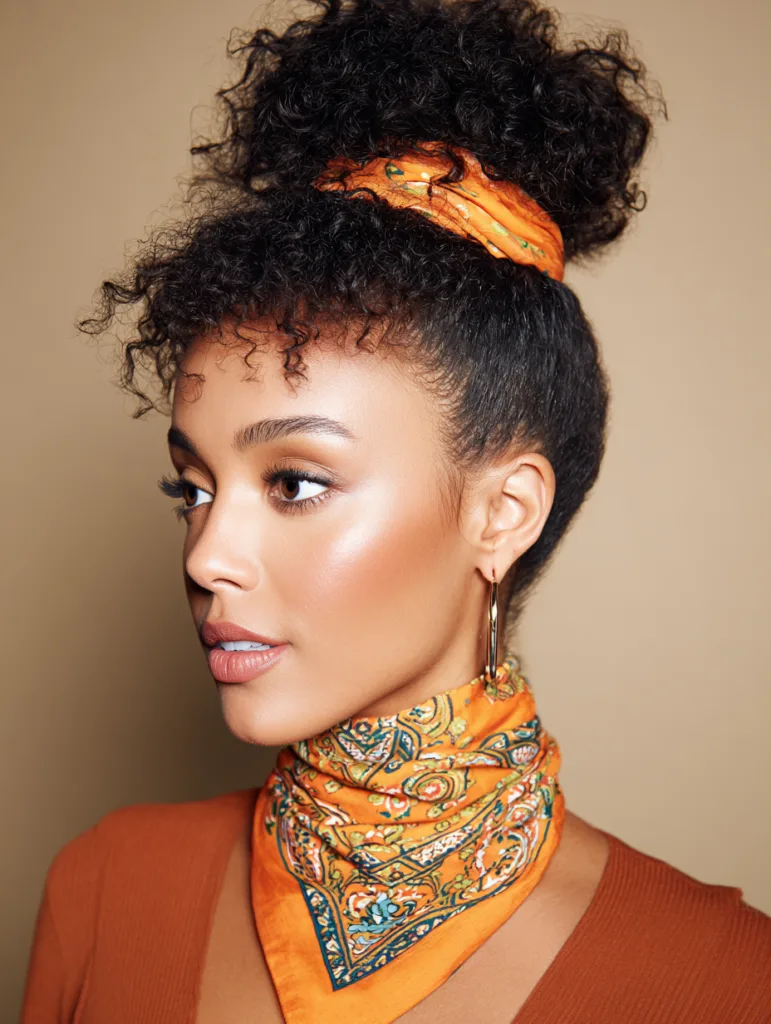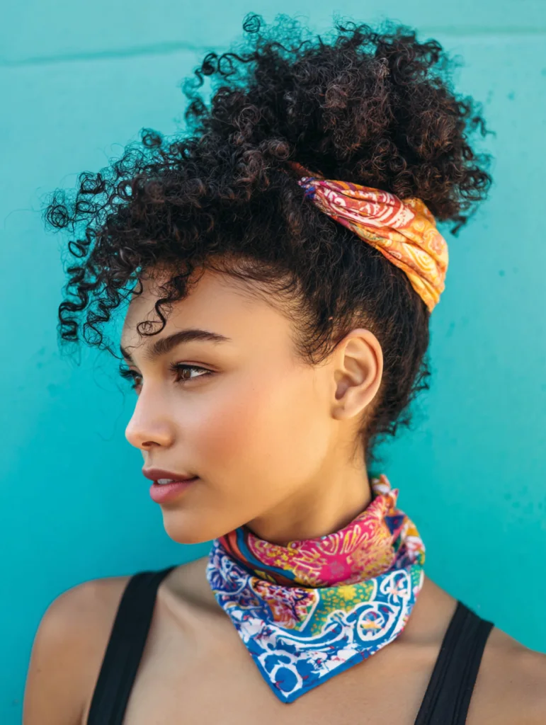 This style wraps a colorful bandana around a high top knot, adding height and structure. It suits round and square faces because the lifted bun elongates your profile. Thick and curly hair works especially well since the knot holds volume without slipping. The bandana provides extra grip, which keeps the bun steady throughout the day.
