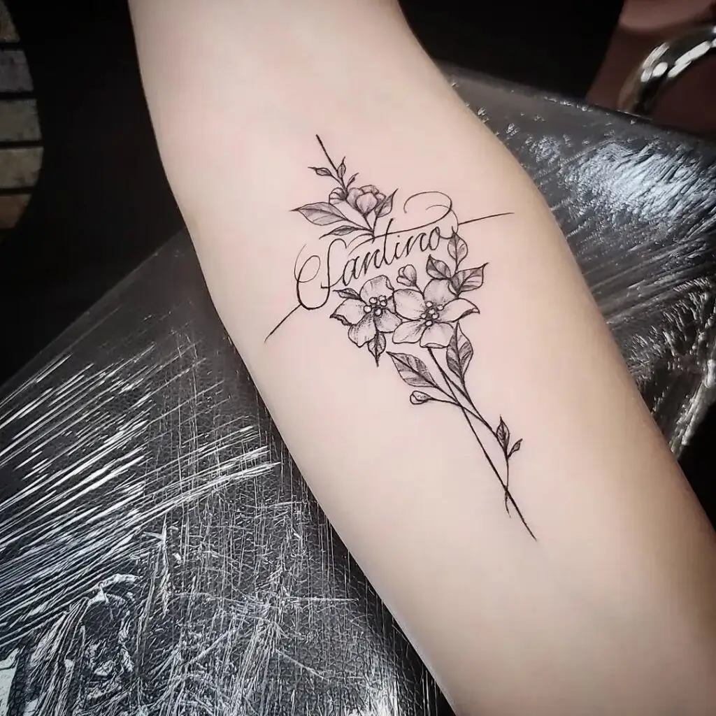 Across the horizontal line, the name “Santino” is written in elegant script, turning the tattoo into a meaningful dedication. Whether in memory or in celebration of a loved one, this design beautifully captures both spiritual and emotional significance through fine lines and graceful floral details.