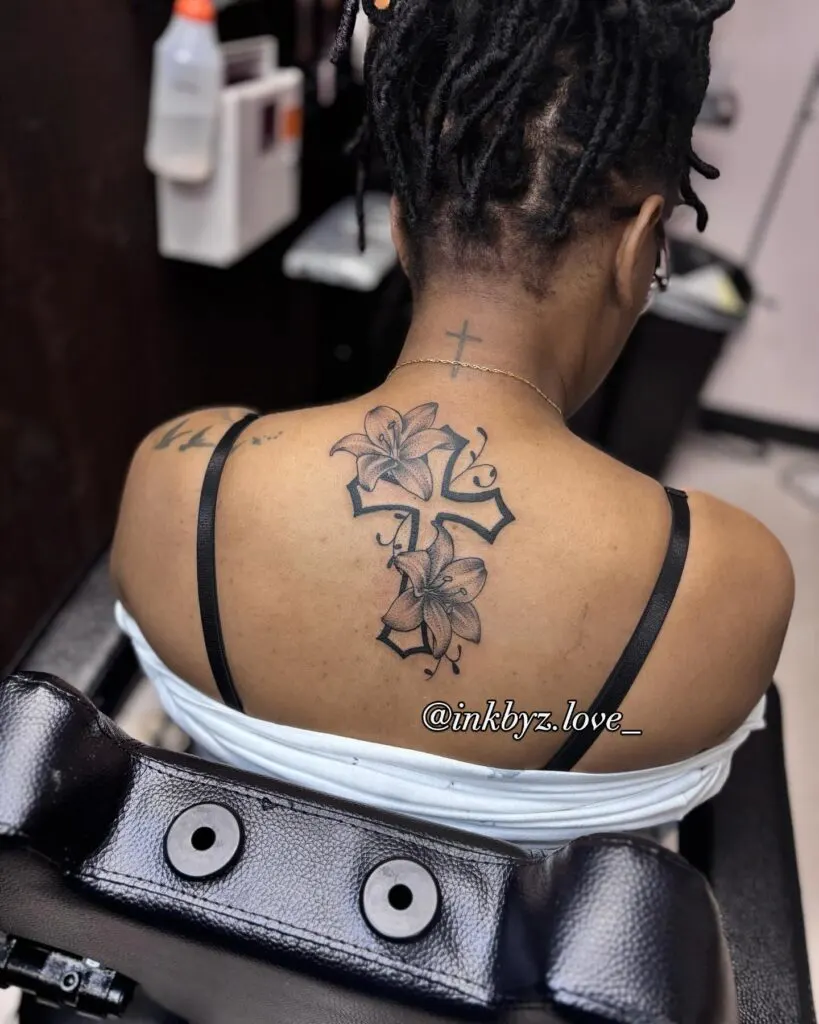 The lilies add a touch of femininity and purity, symbolizing faith, renewal, and devotion. Positioned centrally between the shoulder blades, this piece makes a strong visual and spiritual statement. It’s a perfect design for someone wanting a meaningful and visually impactful back tattoo.