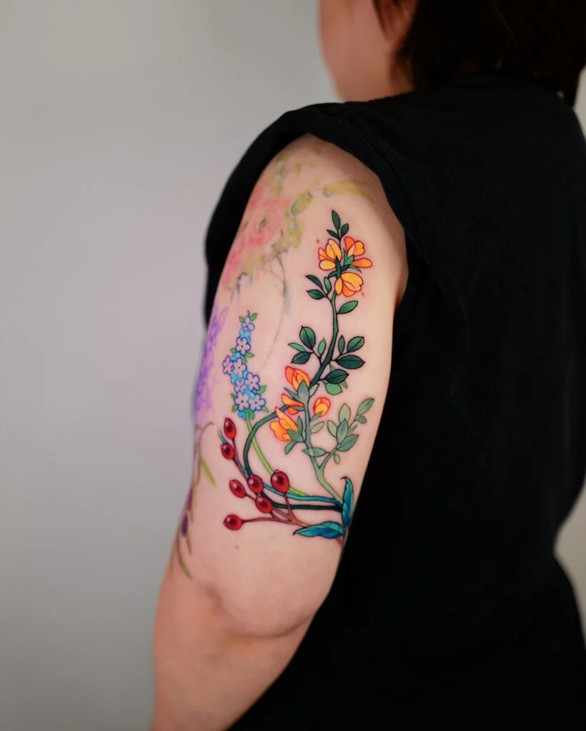 This stunning upper arm tattoo features a delicate bouquet of vibrant wildflowers, gracefully intertwined along the skin. The warm orange blossoms stand out beautifully alongside blue petals and tiny red berries, creating a striking contrast of colors.