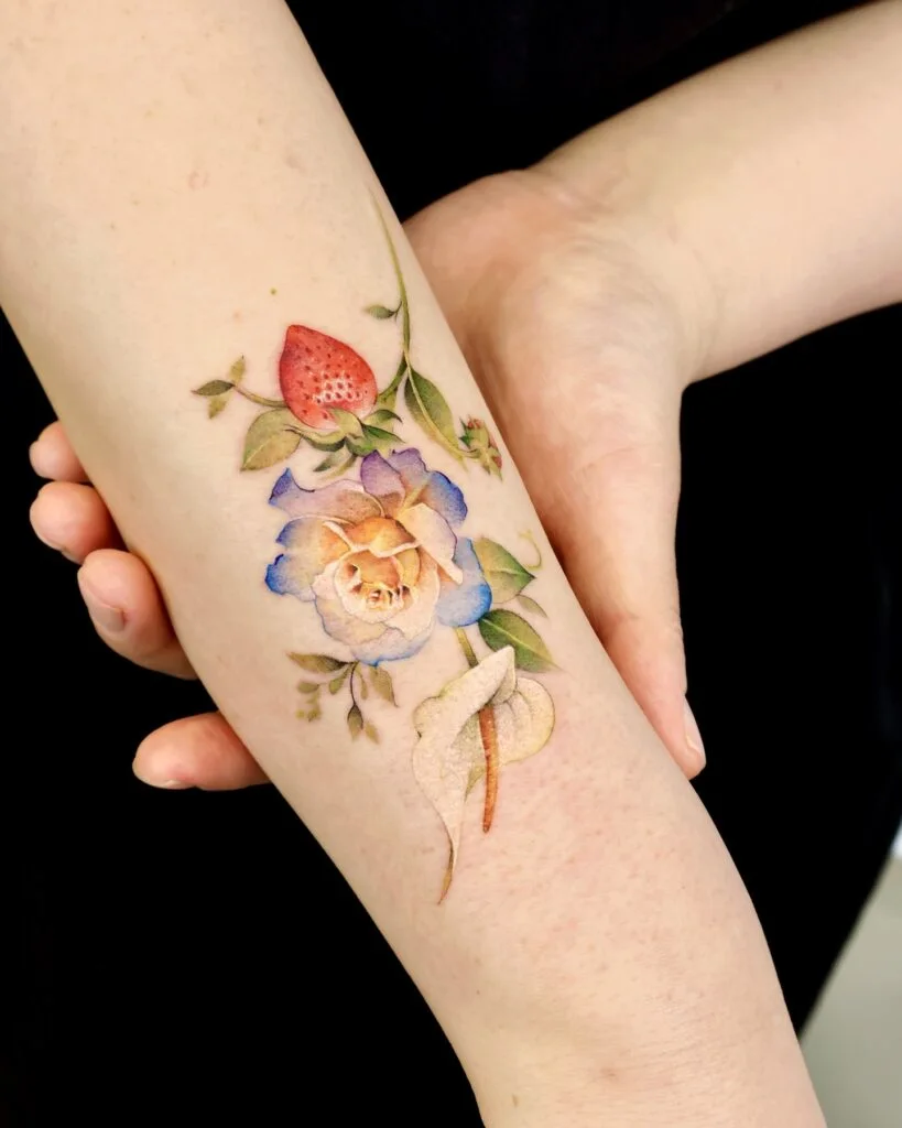 This beautiful forearm tattoo features a soft watercolor rose in dreamy blue and golden hues, complemented by green leafy details. Above the rose, a bright red strawberry adds a playful, summery touch to the design, while a gentle white calla lily sways gracefully beneath it.