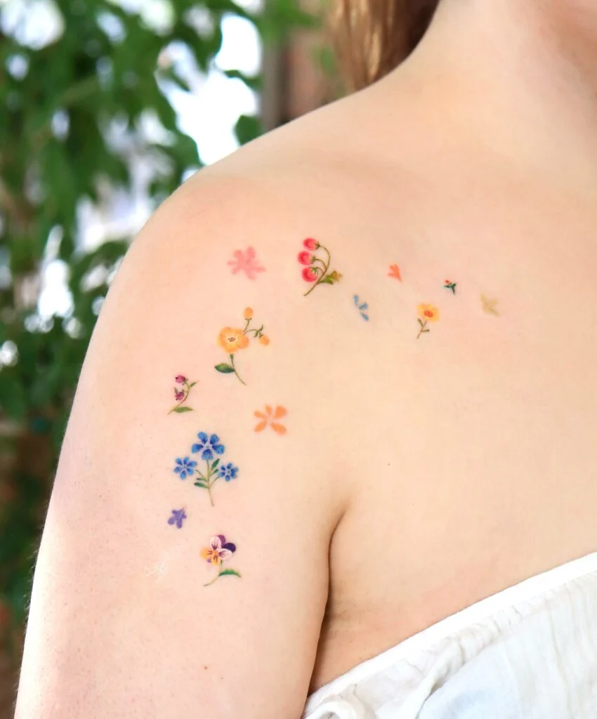 This charming tattoo features a trail of tiny, multicolored wildflowers scattered across the shoulder like a gentle breeze. Soft blues, pinks, yellows, and oranges blend together, creating a joyful burst of color against the skin.