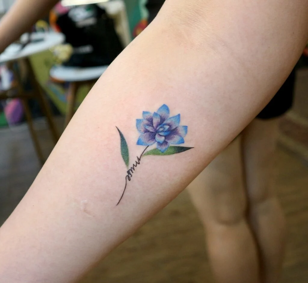 The minimal design enhances the vibrant color, making the flower stand out beautifully on the skin. Perfect for those who want a subtle yet meaningful piece, this tattoo symbolizes both nature and personal connection, balancing artistry and heartfelt sentiment in one graceful design.
