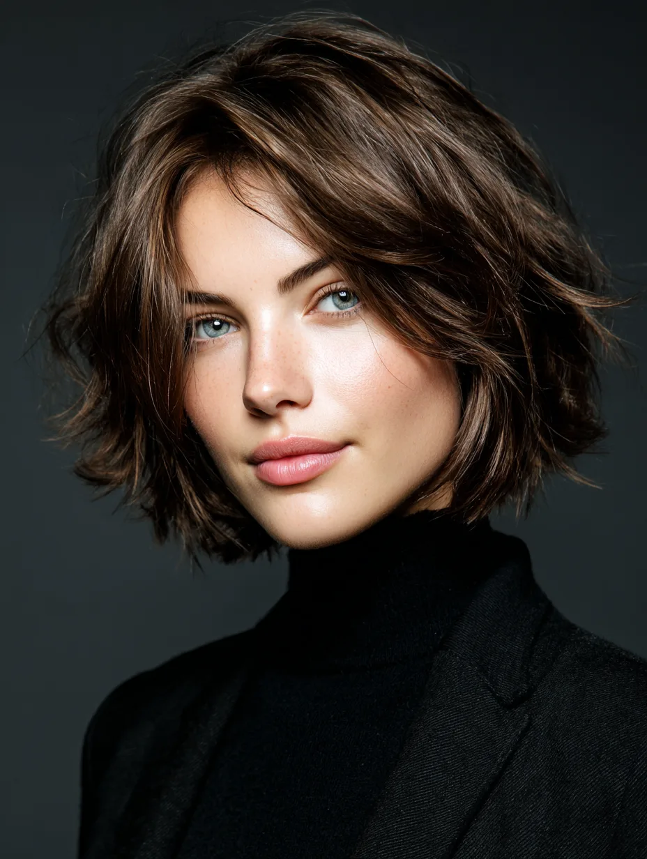 A soft wavy bob flatters round faces by adding vertical movement instead of width. Loose waves draw attention downward and create length. The waves keep the cut light and prevent harsh lines around the cheeks. This style feels natural and easy, not overly styled.