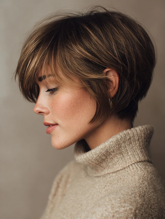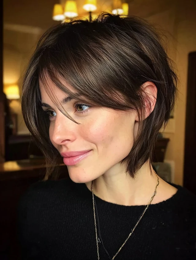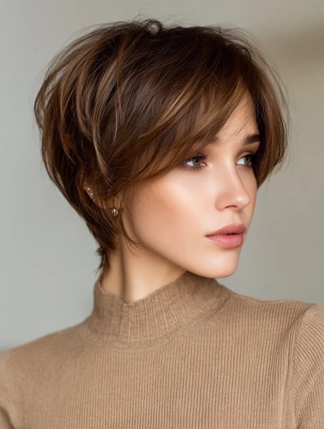 Side swept bangs create a soft diagonal line and add front volume. This cut flatters square and round faces while building density around the face.