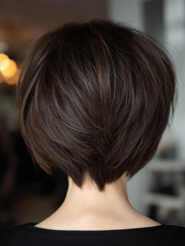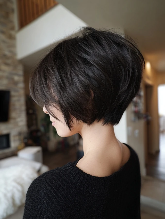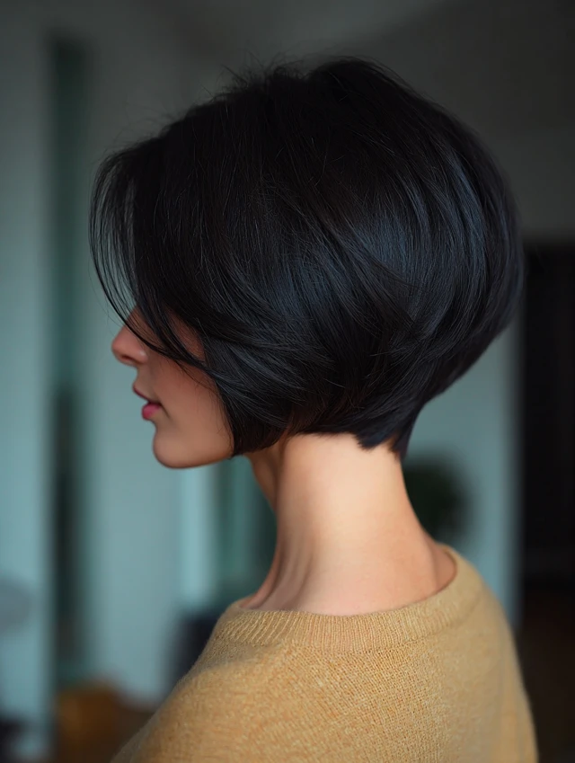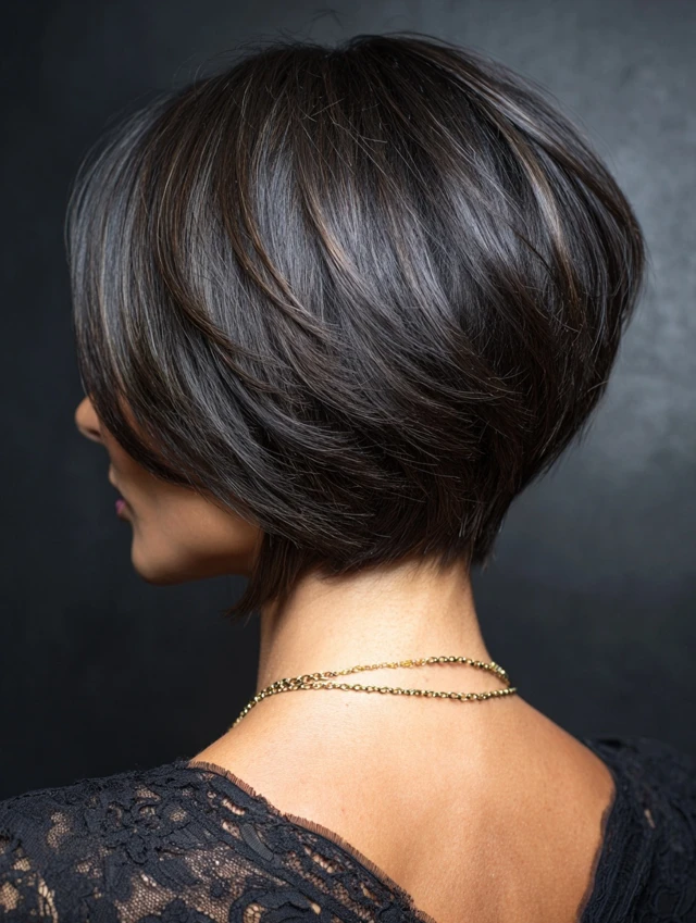 A stacked bob adds layered structure at the back. This builds height and fullness. It flatters round and oval faces by creating lift. Fine hair benefits from this internal shaping.