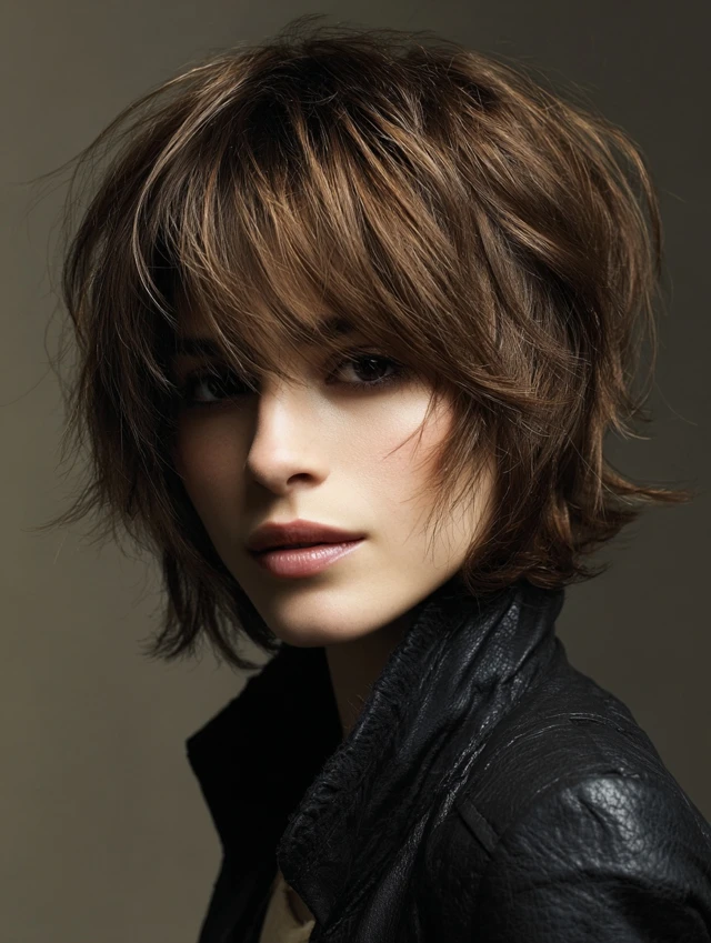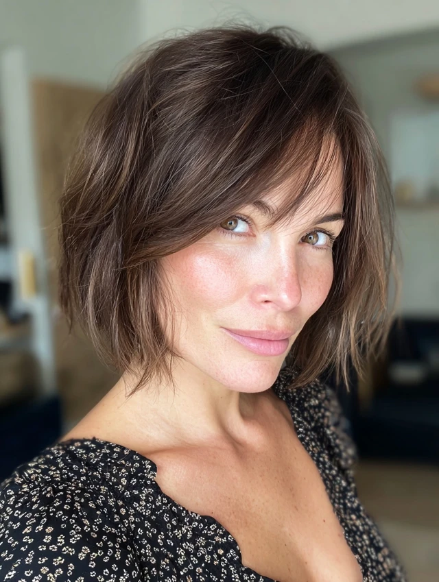 Blow-dry bangs across the forehead for shape. Keep the rest slightly textured. This look feels youthful and balanced. Trim regularly to maintain fullness.