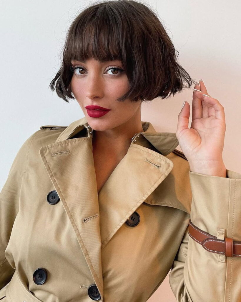 This soft French bob sits just below the cheekbones, creating a flattering frame around the face. The blunt, brow-grazing bangs add balance and instantly draw attention to the eyes. Slightly tousled ends give the cut movement and prevent it from looking too stiff or structured.