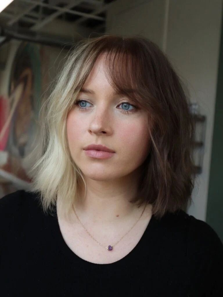 This chin-length bob stands out with its bold two-tone color, blending deep brunette on one side and icy blonde on the other. The soft curtain bangs add balance by gently framing the eyes without feeling heavy.
