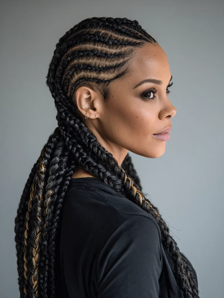 Cornrows with braided ends allow the style to continue past the scalp for a clean, unified look. The stylist forms neat cornrows, then transitions each one into a loose or tight braid once it leaves the scalp. This keeps the ends organized while giving the length some movement.