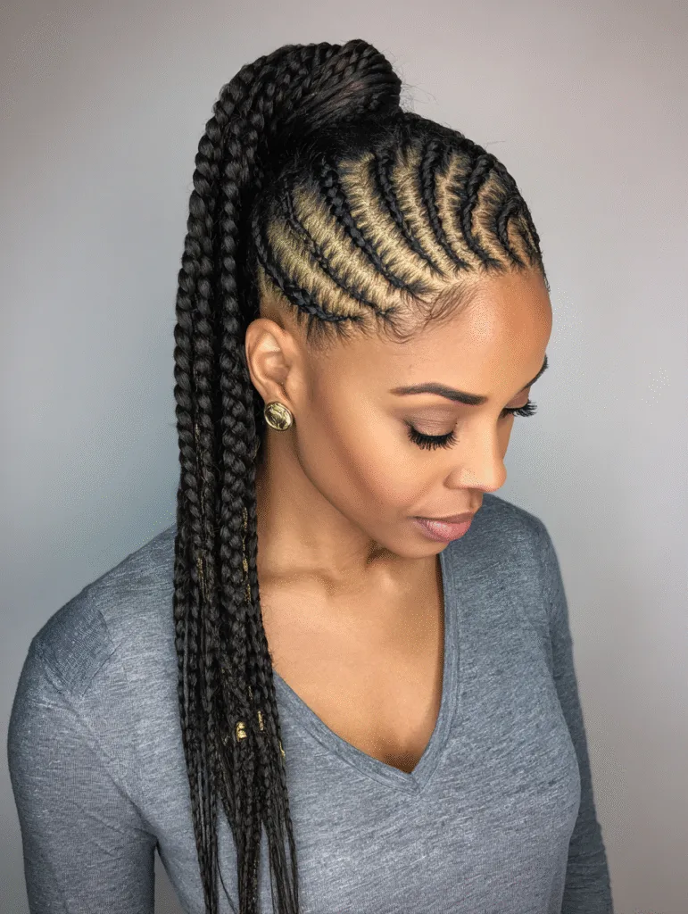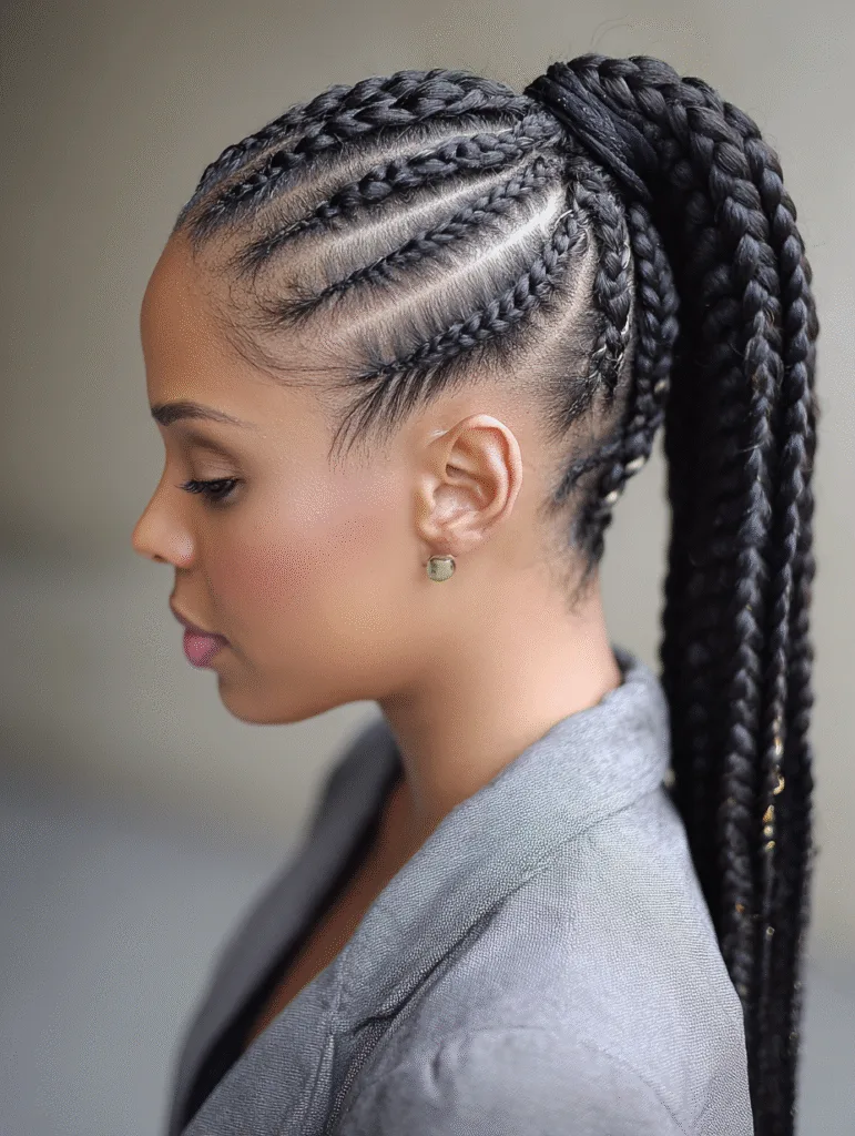 Cornrow ponytail braids gather all the braids toward a single point, creating a look that stays secure all day. The cornrows follow smooth, upward lines that frame the face before joining at the crown or mid-head. Once everything gathers, the braids fall like a sleek ponytail that moves easily.