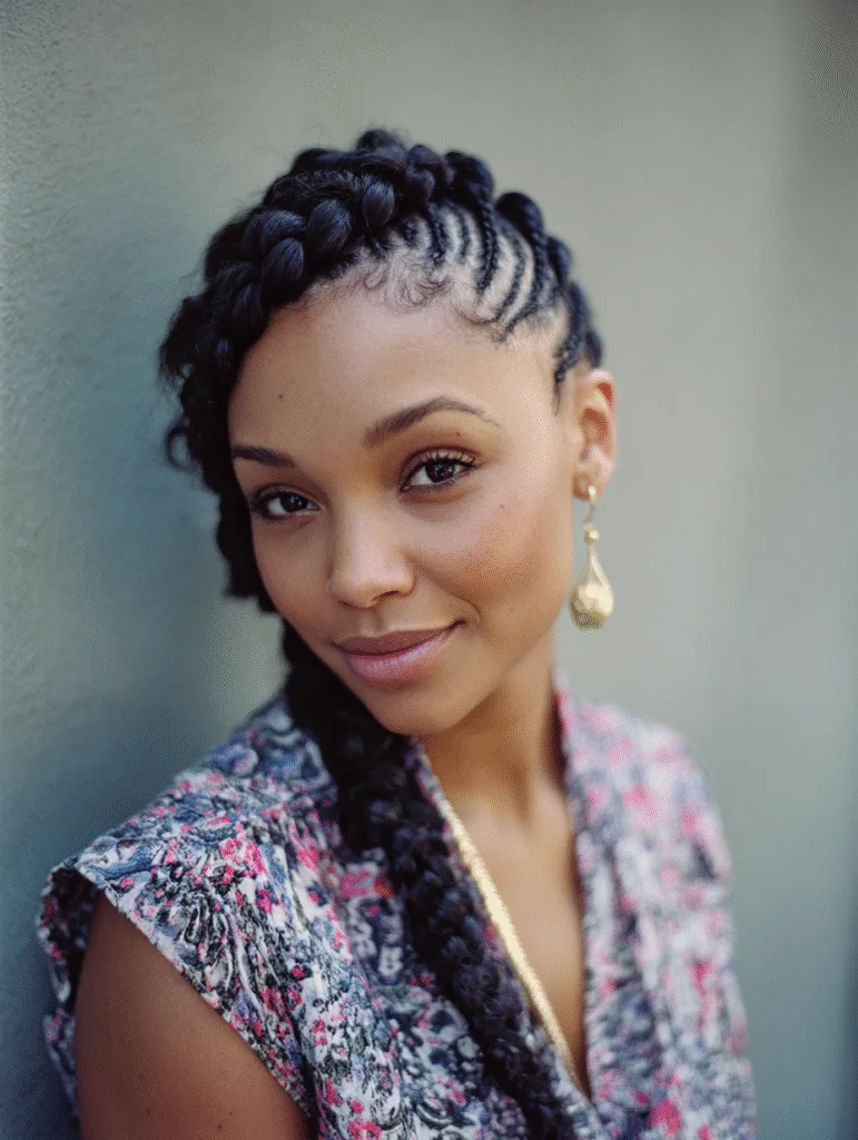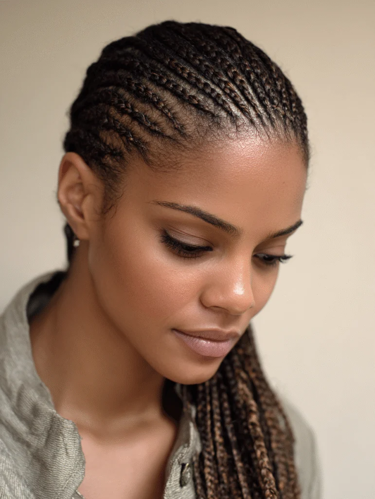 Side cornrows shift all the braids toward one direction, creating a look that feels soft while still staying secure. The stylist parts the hair diagonally and guides each braid across the head, ending them along one side. This placement gives the style a gentle sweep that frames the face nicely.
