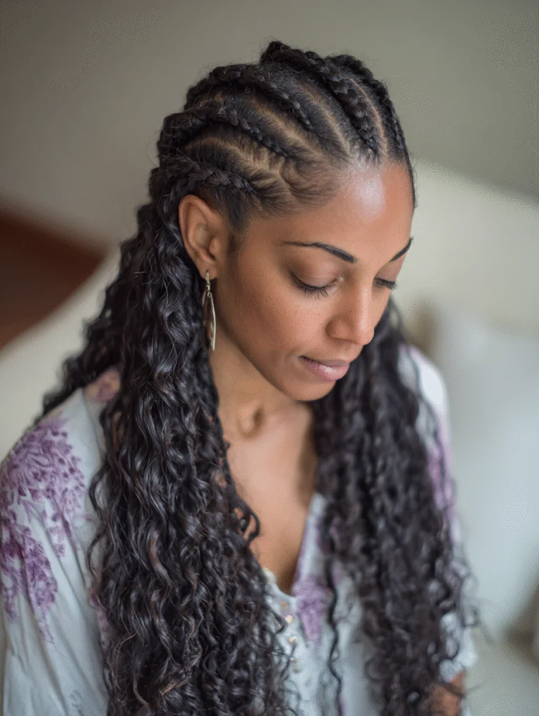 Goddess cornrows mix tight scalp braids with long, loose curls woven between sections. The stylist starts with neat cornrows, then adds wavy strands to soften the overall look. This creates a blend of structure and movement that feels relaxed without losing definition.