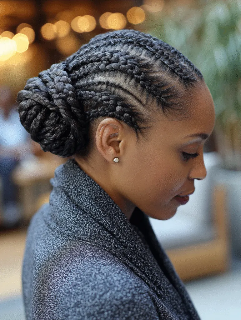 Cornrows that gather into a low bun offer a calm, tidy look that works for busy days. The braids follow straight or curved parts toward the nape, where they wrap into a small bun. This placement keeps the hair comfortable, especially during long hours of work or school.