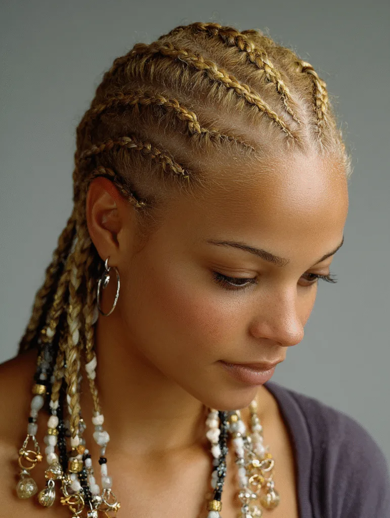 Cornrows with beads add sound, color, and movement to a classic braided look. The stylist forms clean cornrows, then threads beads onto the ends for a simple finish that stands out. You can choose wooden, metallic, or clear beads depending on your style.