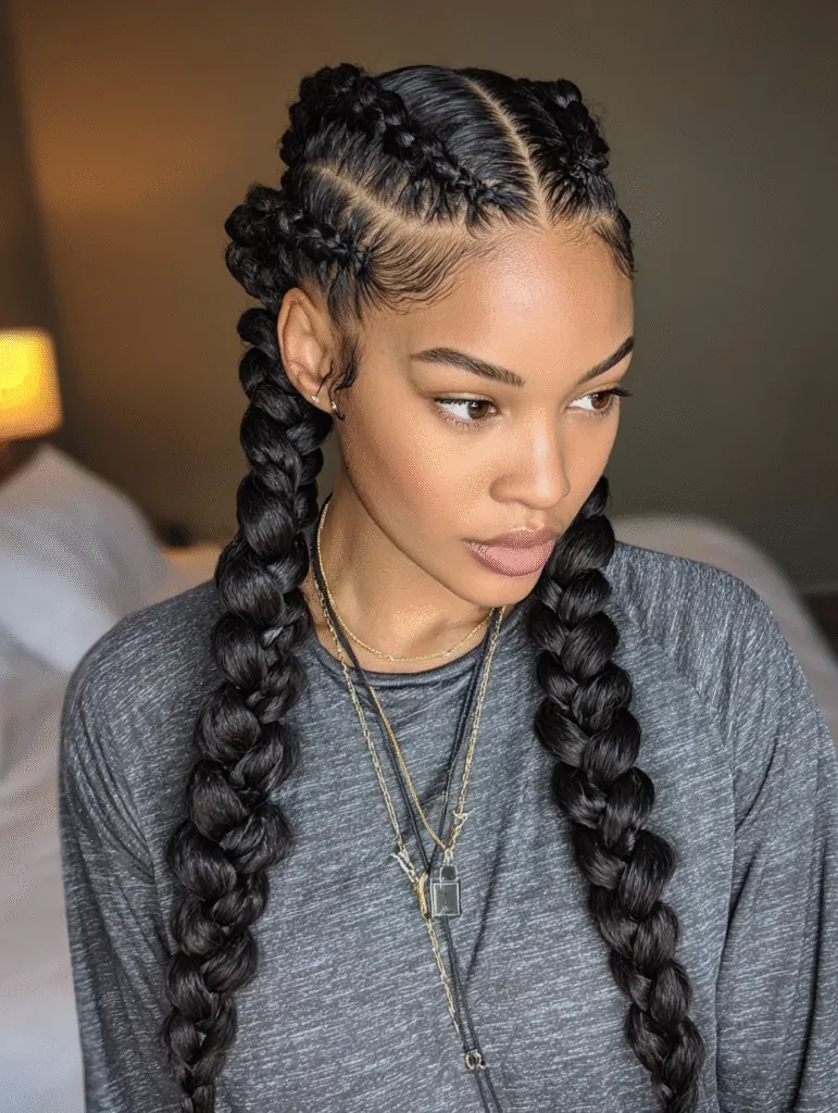 Cornrows that gather into two braided pigtails create a playful look that still feels structured. The stylist parts the hair down the middle and guides the braids toward each side. Each group of cornrows joins into a long, thick braid that hangs neatly.