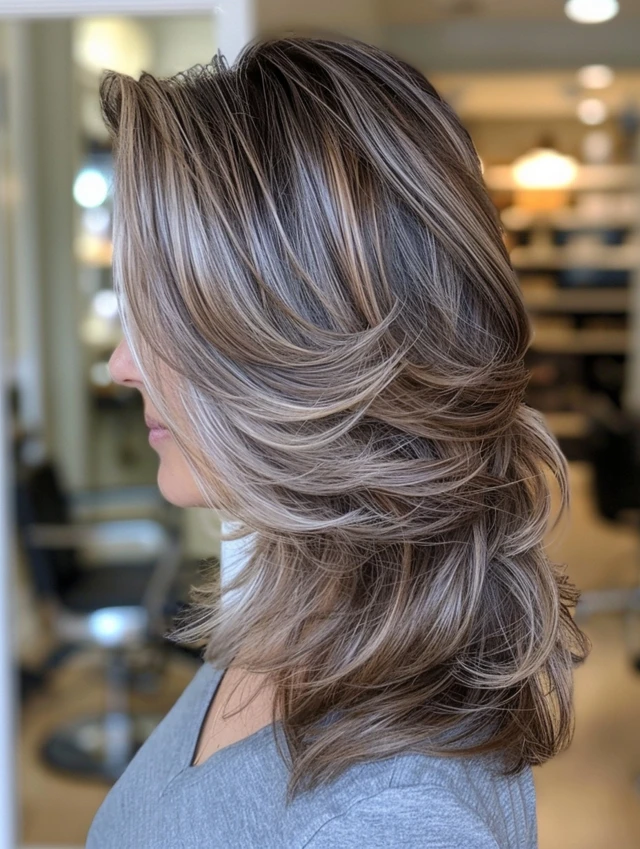 Balayage highlights blend naturally with brown hair, adding silver streaks gradually from mid-length to ends. Oval and round faces benefit, as the gradient elongates the face. Fine hair appears thicker due to the layered effect.