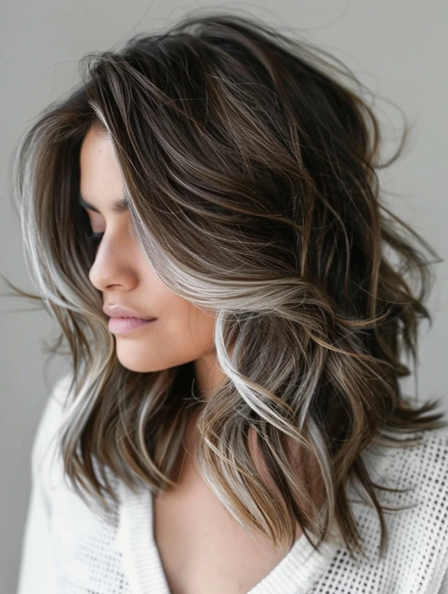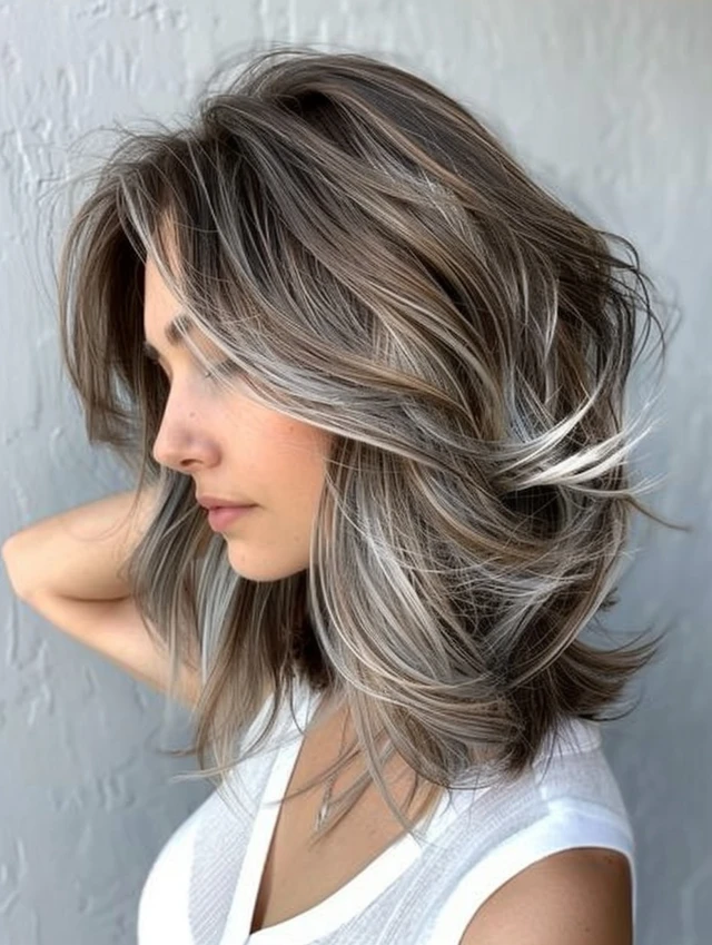 A layered lob with silver tips gives depth and movement to brown hair. Works for oval and heart-shaped faces, adding dimension while highlighting layers. Fine hair gains volume from the subtle color contrast.