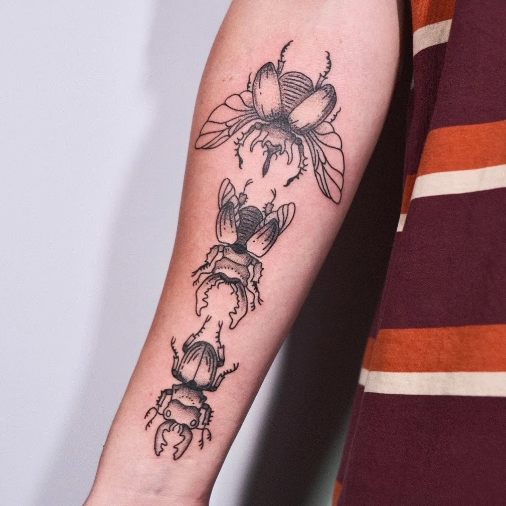 This tattoo features three beetles arranged vertically, each with distinct characteristics and intricate details. The top beetle displays open wings, suggesting motion or flight, while the others highlight their strong mandibles and unique body shapes. The fine linework and shading provide depth and texture, giving the beetles a realistic yet artistic look.
