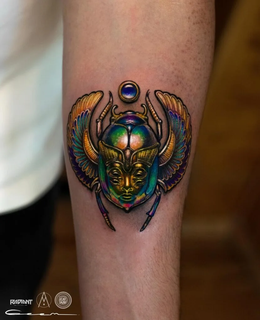 This tattoo showcases a vividly colored scarab beetle with intricate wings and a glowing orb, inspired by ancient Egyptian symbolism. The scarab features a regal human-like face on its shell, adding a divine or mystical quality. The rich gradient hues of gold, blue, and purple create a mesmerizing effect, making the design stand out as a bold statement piece.