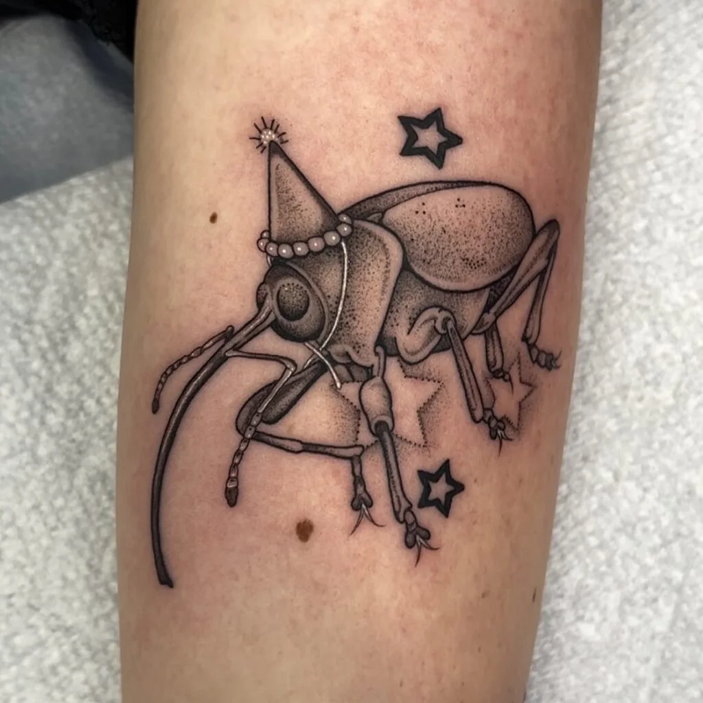 This tattoo portrays a beetle wearing a playful party hat adorned with a pearl-like trim and a radiant star on top. Surrounding the beetle are whimsical stars, adding a celebratory and magical atmosphere. The dot work shading adds depth and texture, enhancing the beetle’s detailed anatomy while maintaining a lighthearted tone.