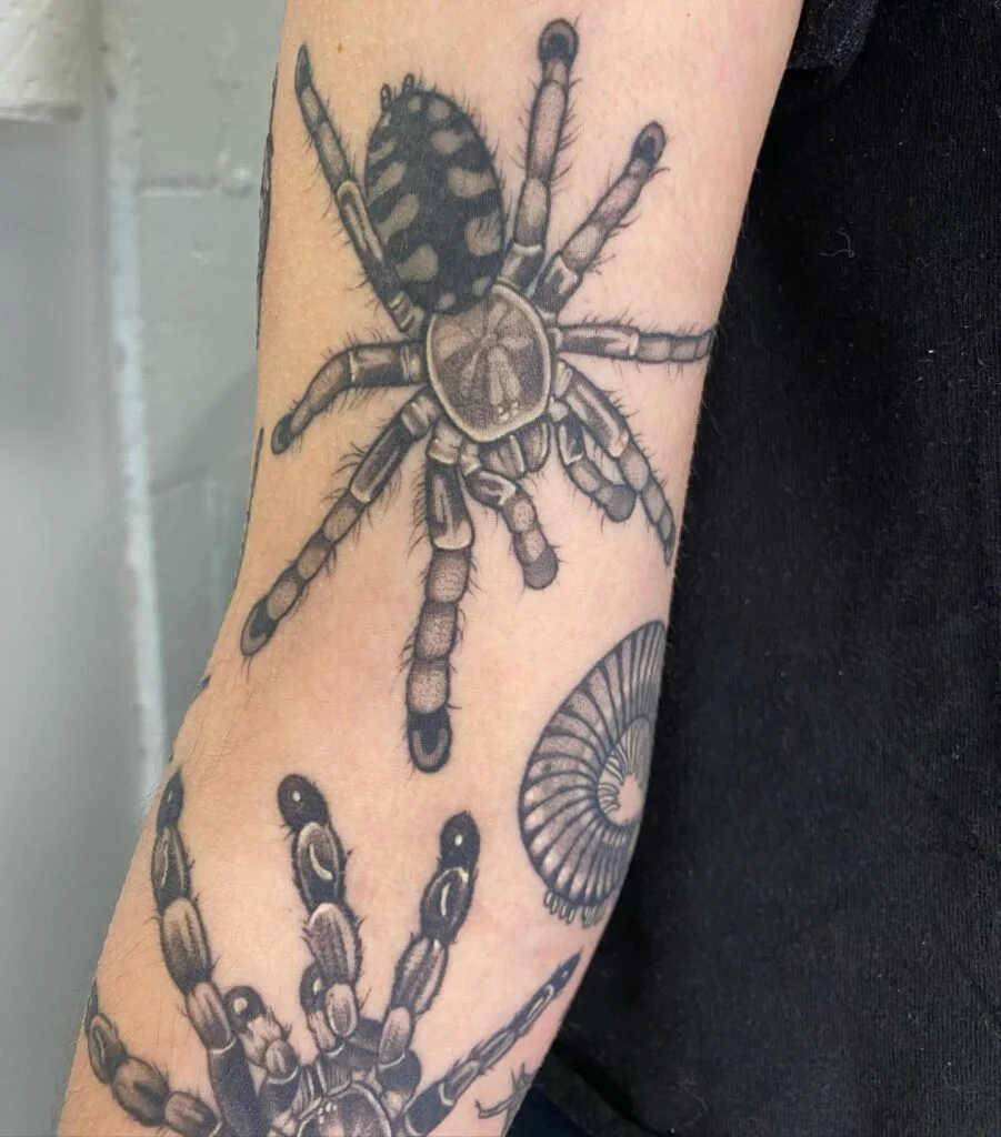 This tattoo showcases a highly detailed tarantula, emphasizing its textured legs, patterned abdomen, and lifelike anatomy. The fine shading and intricate linework give the design depth and realism, capturing the spider’s natural form. Positioned alongside other insect-inspired tattoos, it creates a cohesive entomological theme.