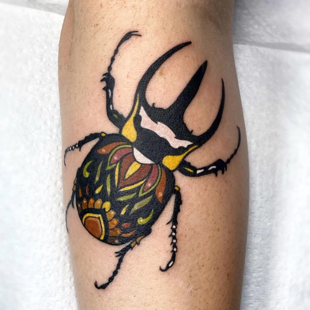 This tattoo features a bold, stylized beetle with intricate patterns and vibrant colors, including shades of yellow, orange, green, and black. The decorative details on the beetle’s back resemble a tribal or ornamental design, adding a sense of artistry and cultural flair.